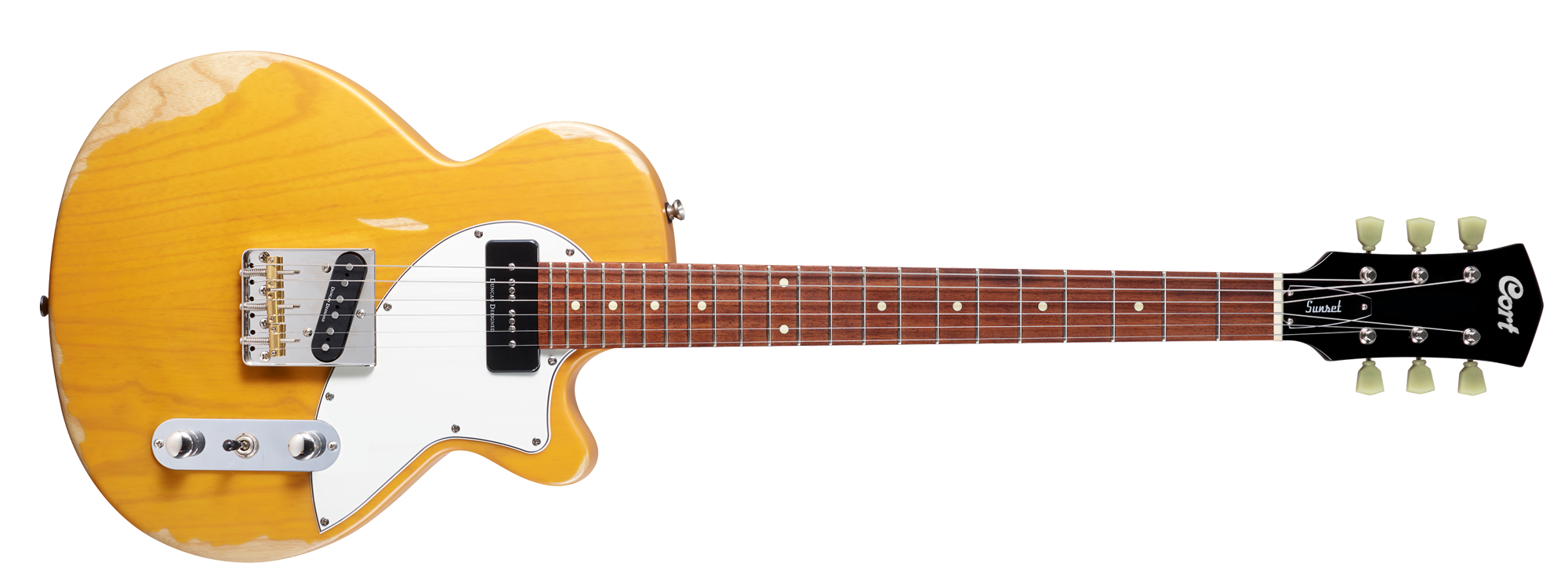 A hybrid of the T-style and the LP-style, the Sunset TC incorporates the features of two types of iconic solid-body electric guitars. The ash body is lightweight but has a tight and punchy sound with emphasis on the high-midrange. The guitar has a distressed finish that’s available in Worn Butter Blonde or Worn White Blonde, and is built with ash tonal wood and a bolt-on hard maple neck. It also features a jatoba fingerboard with 9.45’’ radius on a 25.5′ scale.